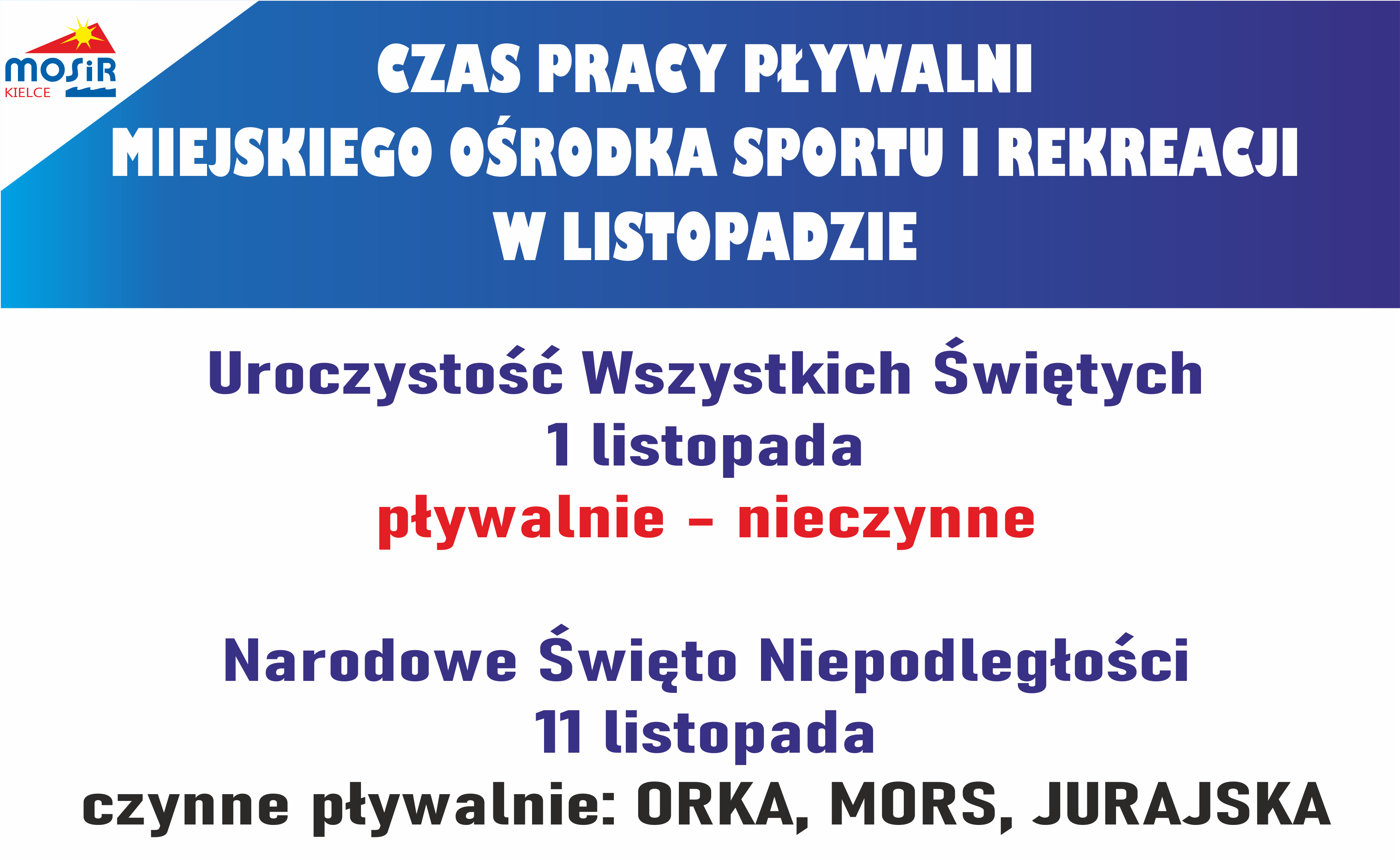 Pływalnie MOSiR Kielce w dniu 1 listopada będą nieczynne z powodu Uroczystości Wszystkich Świętych. W dniu 11 listopada z uwagi na Święto Niepodległości czynne będą pływalnie: ORKA, MORS i JURAJSKA .